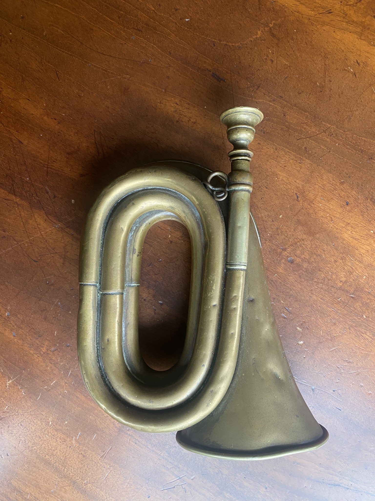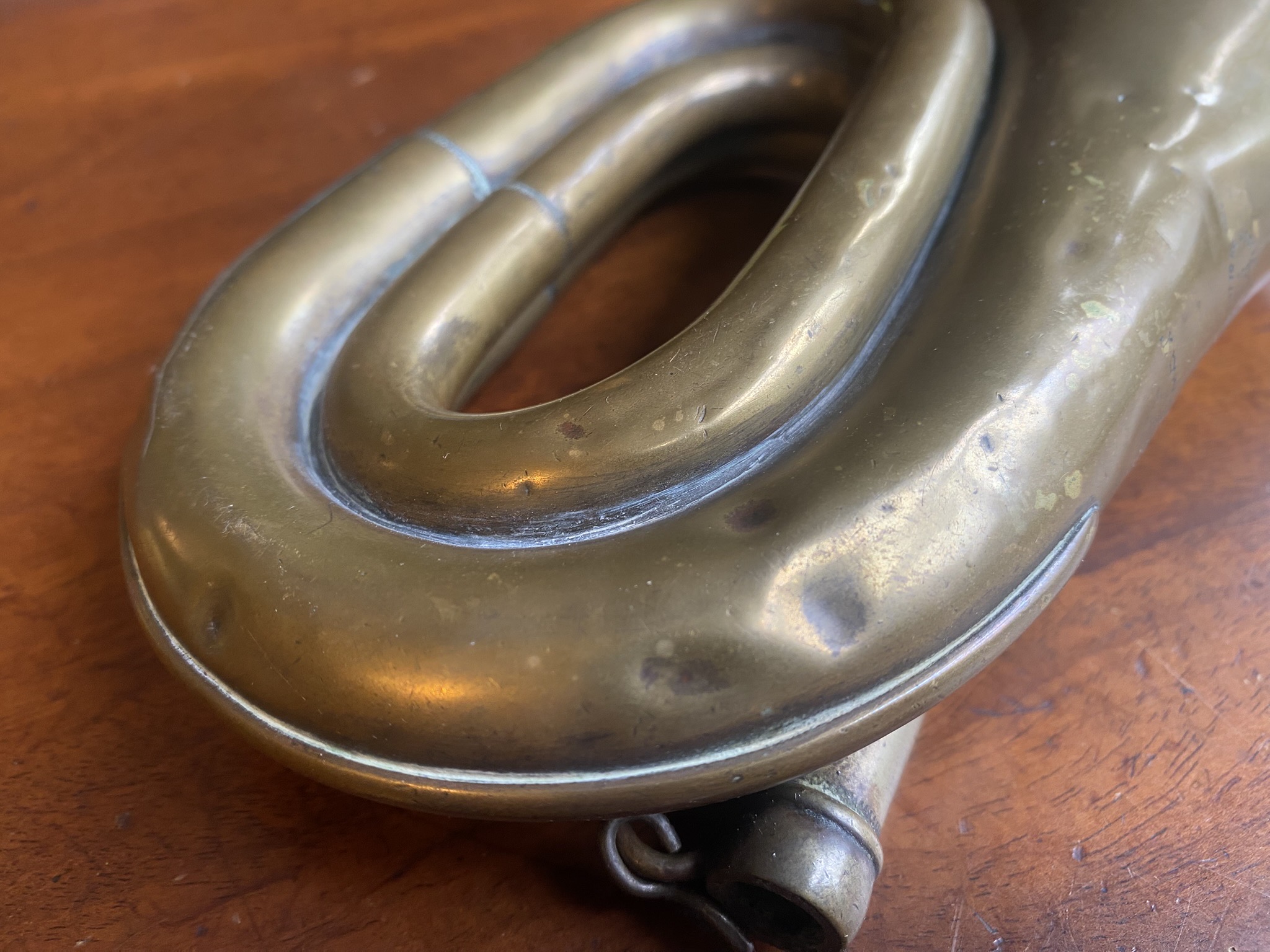 Cycling 'Buglet' A good, very rare cycling 'buglet' by Henry Keats, late 19th C. Stamped with maker's name on the bell, Henry Keats and Sons , Matthias Rd, Stoke Newington, London : With original mouthpiece, stamped Henry Keats. All made in brass, 4 turns, plays well, with minor dents, never repaired, all joints intact. Dimensions: overall length 16 cms or 6 3/8", excl mouthpiece, max height 13.5 cms or 5 3/8", width 6 cms or 2 3/8" Bello oval 85 mm or 3 3/8" by 60 mm or 2 3/8". These are very rare, and this one in brass is even more rare, (most are copper with brass.) An overall delightful item for any collection, and working too!