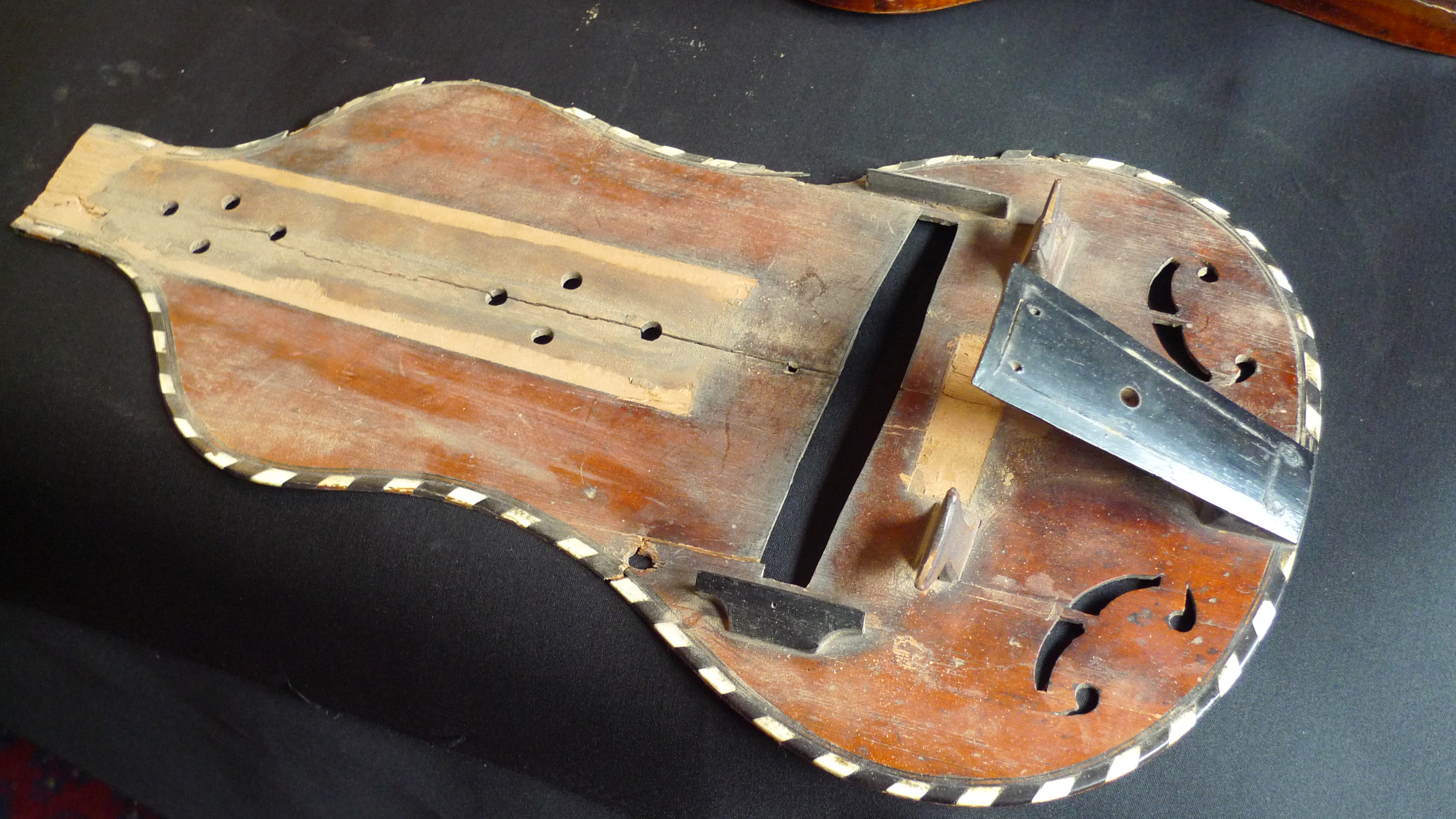 - Hurdy Gurdy, French, branded and by Colson, Mirecourt, (for restoration). This is a near-complete original, which a long time ago suffered from a very poor repair. I believe it could be restored, I had intended to do it but no longer have the time. It is sold now 'as seen' , as I found it, ie dismantled, with most of the original parts, apart from the keyboard cover which is missing, but an easy part to reproduce. It has: the main body, guitar shaped, with one rib very badly damaged, which is the main problem. The soundboard is in 2 pieces, but complete, the bars there, the friction wheel present, in good condition, with original spindle and handle, and the keyboard is complete and mostly all original, and a lovely carved head, which is the best part. The photos show all of the items which are present, it is all there apart from the keyboard cover. Very hard to price, I have put a figure on it, but am open to any serious offers around £500.