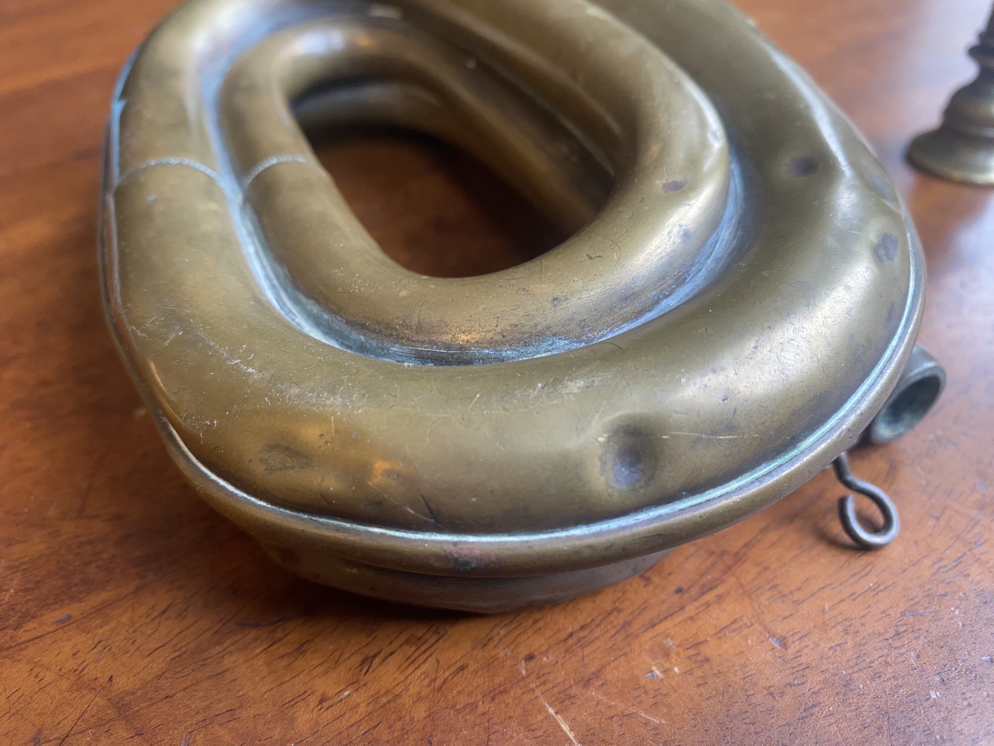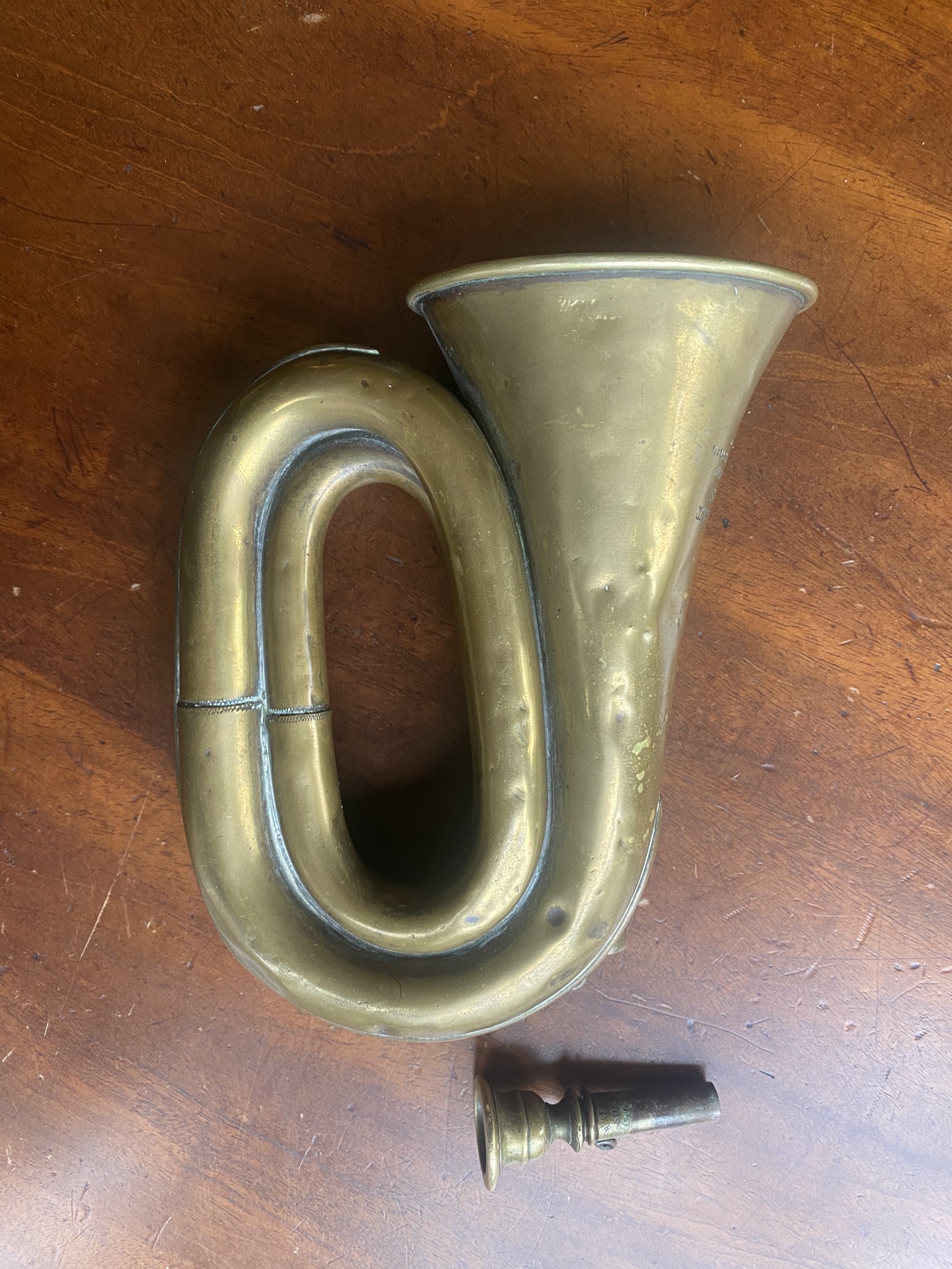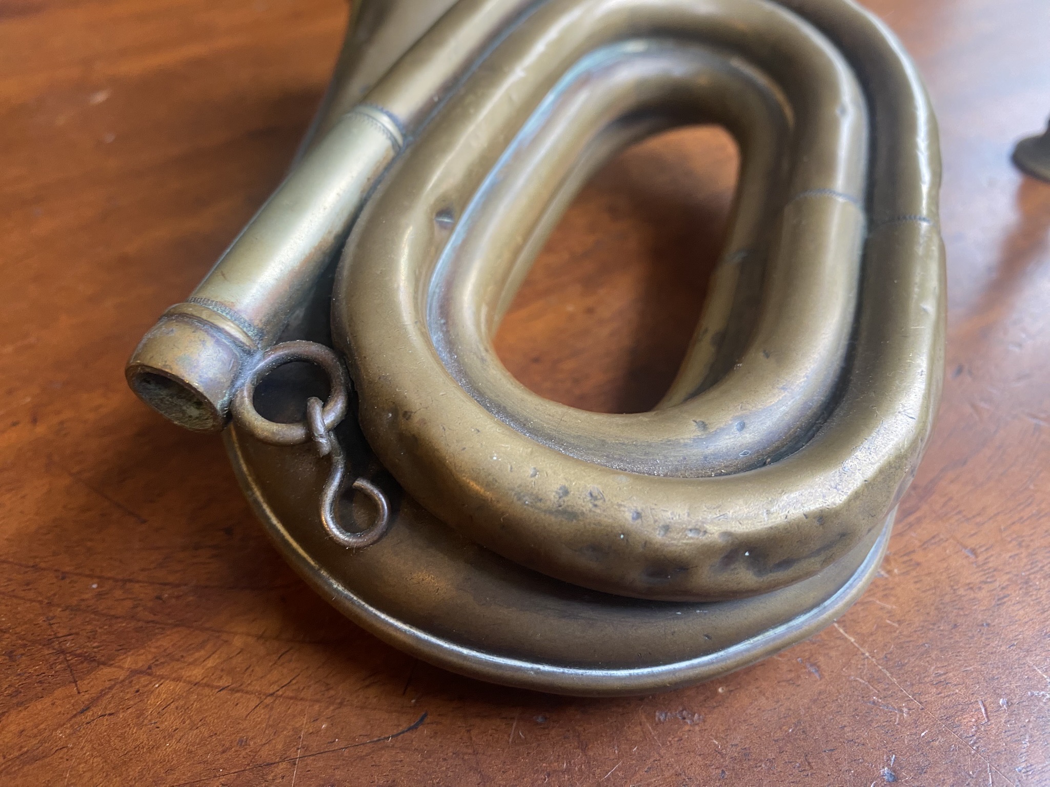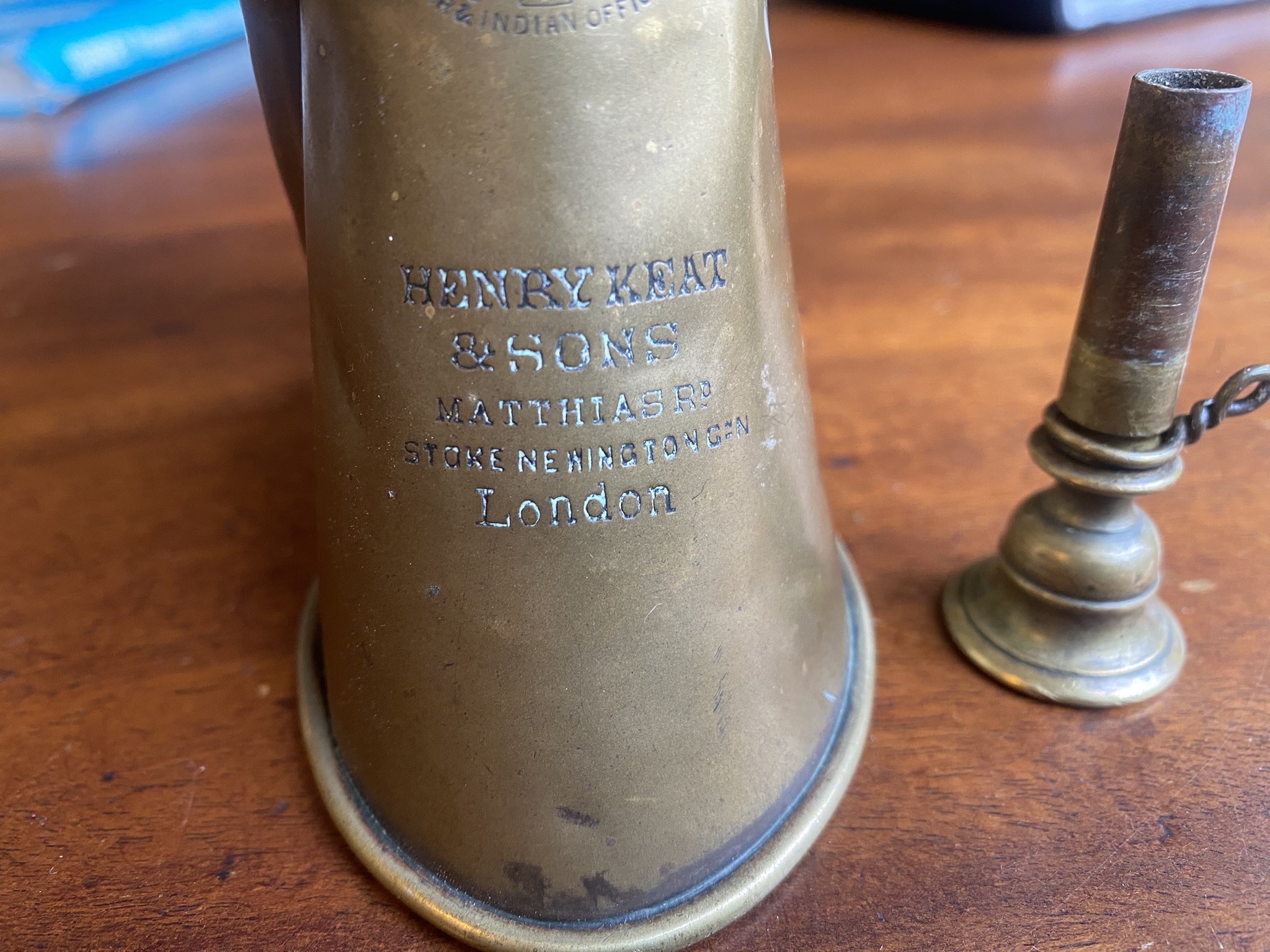 Cycling 'Buglet' A good, very rare cycling 'buglet' by Henry Keats, late 19th C. Stamped with maker's name on the bell, Henry Keats and Sons , Matthias Rd, Stoke Newington, London : With original mouthpiece, stamped Henry Keats. All made in brass, 4 turns, plays well, with minor dents, never repaired, all joints intact. Dimensions: overall length 16 cms or 6 3/8", excl mouthpiece, max height 13.5 cms or 5 3/8", width 6 cms or 2 3/8" Bello oval 85 mm or 3 3/8" by 60 mm or 2 3/8". These are very rare, and this one in brass is even more rare, (most are copper with brass.) An overall delightful item for any collection, and working too!