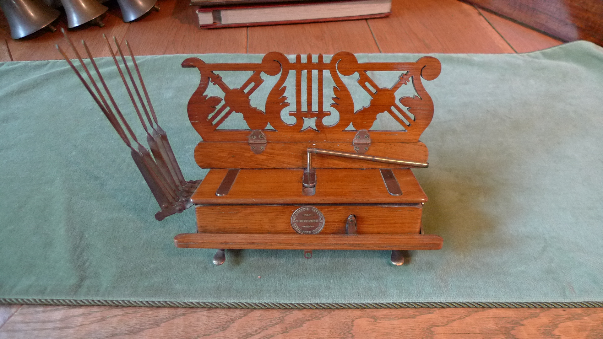 Page Turner: Padbury's patent. A good , interesting (not to mention fascinating), very rare Victorian mechanical automatic page turner, Padbury patent, all working, mechanical elements all working and in good condition, one small part of wooden scroll work on back support missing, and original in every detail